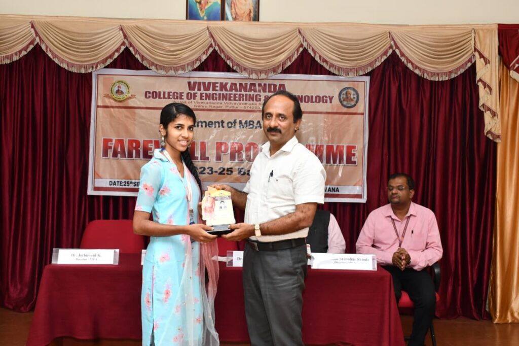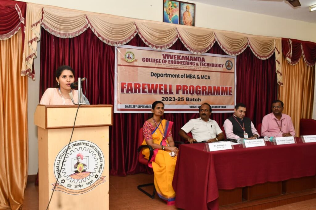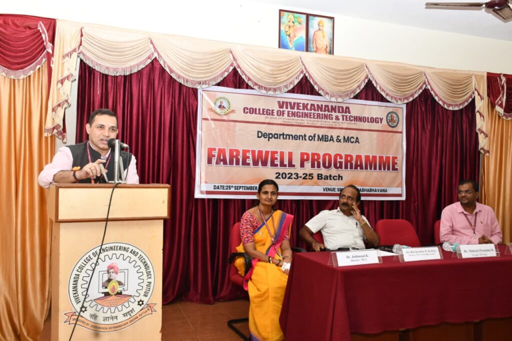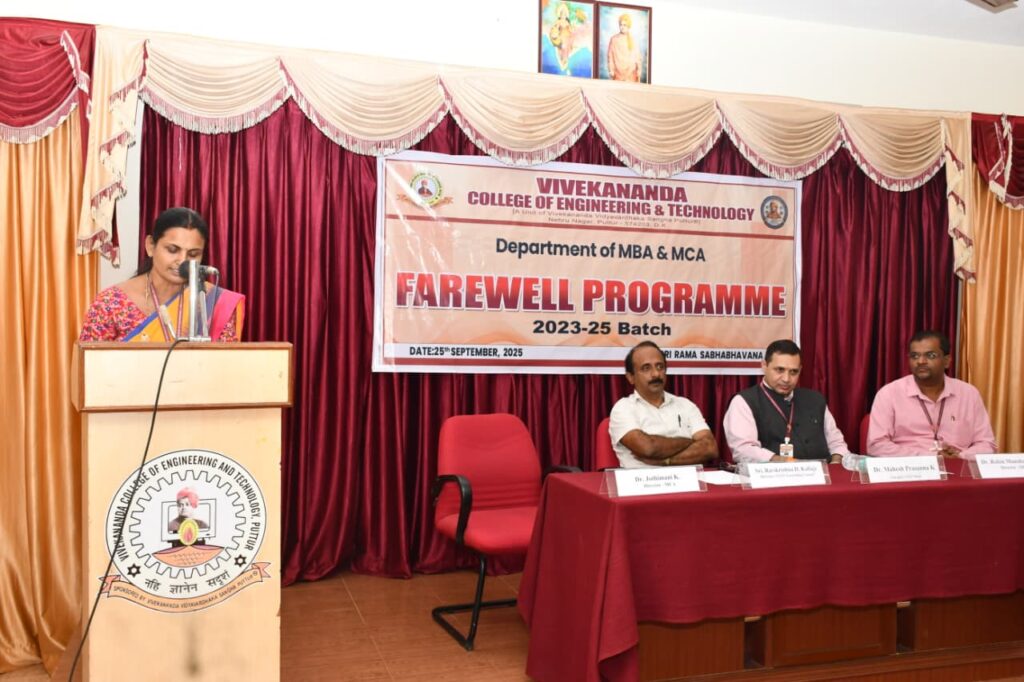he Department of MBA and MCA, Vivekananda College of Engineering and Technology, Puttur, organized a Farewell Programme for the 2023–25 batch on Thursday, 25th September 2025, at Sri Rama Sabhabhavana. The event commenced at 11:30 AM with a warm welcome extended to all dignitaries, faculty, staff, and students. The programme was presided over by Sri Ravikrishna D. Kallaje, Director, VCET Governing Council, Puttur, and was graced by the esteemed presence of Dr. Mahesh Prasanna K., Principal, VCET, Dr. Robin Manohar Shinde, Director, MBA, and Dr. Jothimani K., Director, MCA.