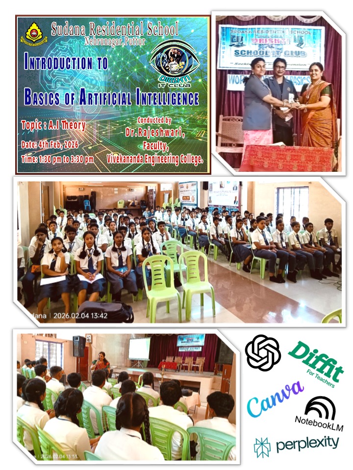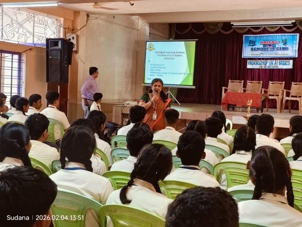 Dr. Rajeshwari M, Assistant Professor, Department of MCA, Vivekananda College of Engineering & Technology, Puttur, delivered an insightful guest session on “Artificial Intelligence in Education” for SSLC students of Sudana Residential School on 4th February 2026 from 1:30 PM to 3:30 PM.