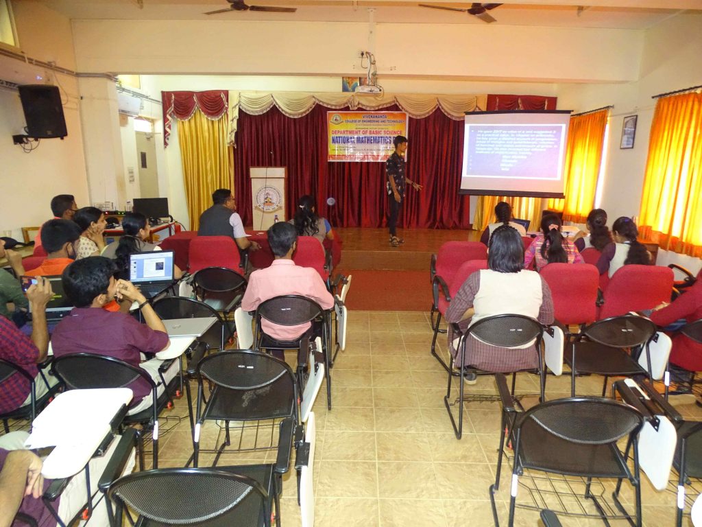 India’s National Mathematics Day is celebrated every 22 nd December with numerous Educational events held at schools and universities throughout the country. In 2017, the day’s significance was enhanced by the opening of the Ramanujan Math Park in Kuppam, in Chittoor, Andhra Pradesh. National Mathematics day 2021 was celebrated by the Department of Basic Science on 23 rd December 2021 by conducting various competitions to all students like Power Point Presentation, Penc il Sketch Portrait, and Collage making at Sri Ramasabha Bhavana, Sir M Visvesarayya Hall and Homi J Baba Hall, VCET. Dr Mahesh Prasanna K, The Principal, VCET graced the occasion. HoD’s of various departments were part of this program.